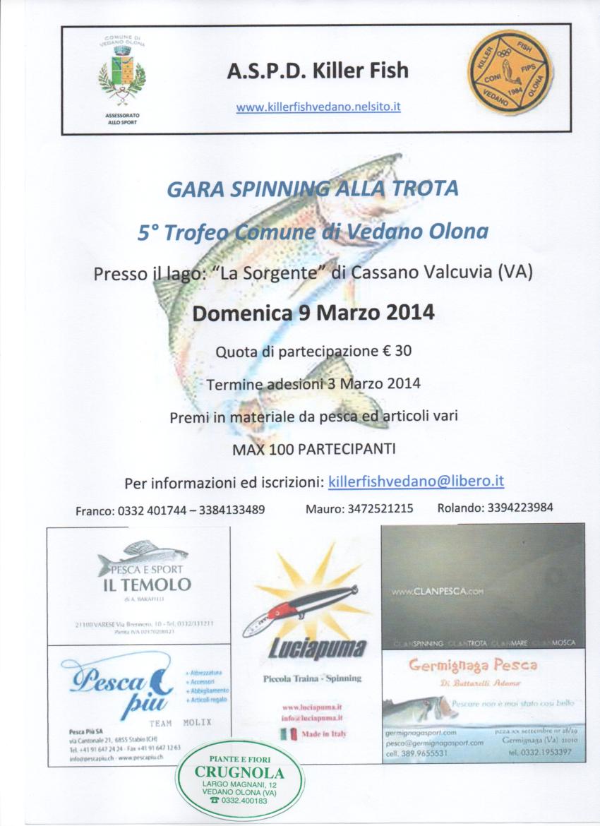 il 9 marzo 2014 presso il lago la Sorgente di Cassano Valcuvia (Va) 5° trofeo Comune di Vedano Olona gara alla trota a spinning.
