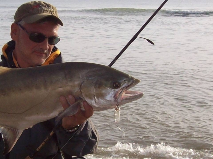 Cattura di Leccia Amia Pescando a Spinning dalla spiaggia cacciata a galla ed ingannata con S. spook Jr. HEDDON , utilizzata canna G-Loomis 844 IMX da 7' da 1 OZ